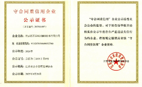 萬泰輔料榮獲江蘇省守合同重信用企業(yè)公示證書
